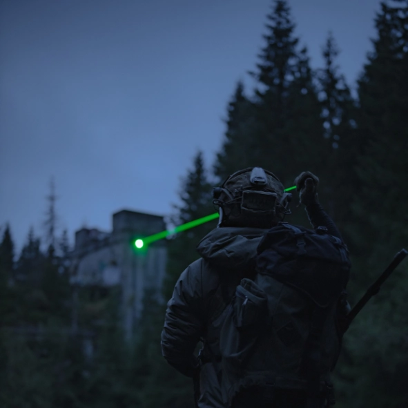 IR laser – Neviditelný pouhým okem, funguje pouze s nočním viděním. Ideální pro noční mise.