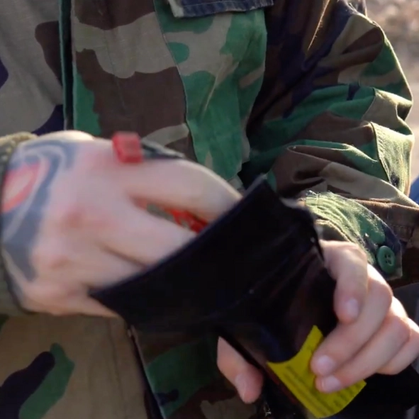 • Sundej popruh, ať se ti se zbraní dobře manipuluje.