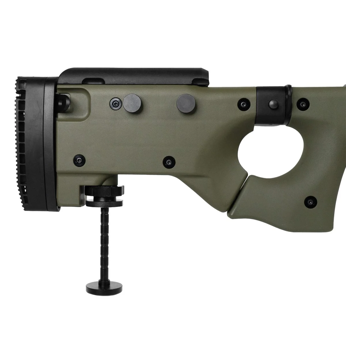 Monopod is a single-leg support device used to stabilise a weapon or optic. Shooters and photographers use it to reduce movement, increase stability, and maintain better control over the aiming direction. It is smaller and lighter than a bipod or tripod and provides quick, simple support—especially for the rear end of a rifle. A monopod is therefore a lightweight and fast rear support ideal for precision long-range shooting, commonly used on sniper rifles as rear stabilisation. For maximum stability, it is paired with a bipod. A tripod offers the highest stability but is bulkier. In airsoft, monopods are mainly used on precision sniper rifles like the Silverback SRS and on zeroing benches for easy and accurate optic adjustment.